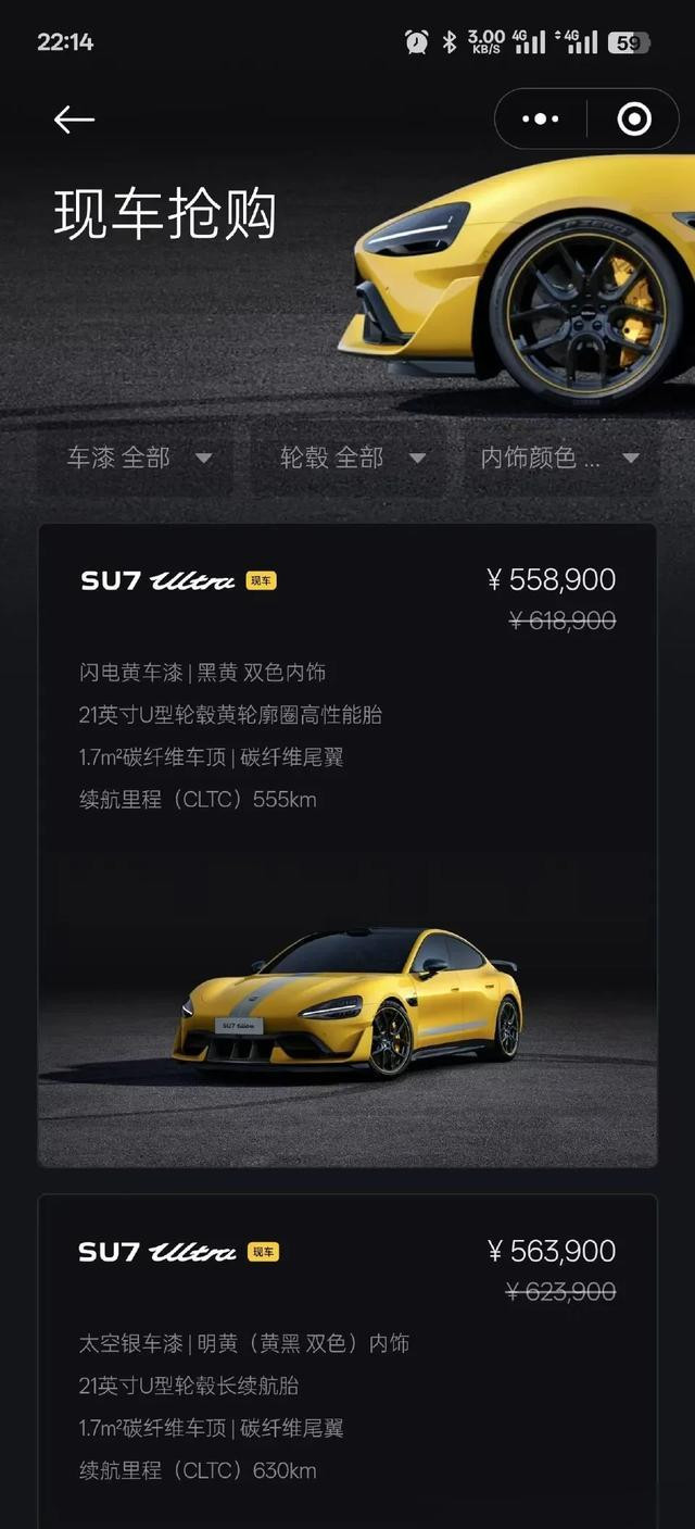 从官方披露的信息来看,SU7 Ultra提供了多款配置选择,包含闪电黄、大空银等个性化车漆,以及高性能胎、碳纤维车顶等高端配置,价格区间横跨55.89万至62.59万元。首日1.5万辆大定订单无疑证明了消费者对小米品牌和技术积累的信任。但现车销售未达预期,尤其是发布会期间主推的无“大鼻孔前机盖”设计未能打动消费者,暴露了产品策略与市场需求之间的错位。